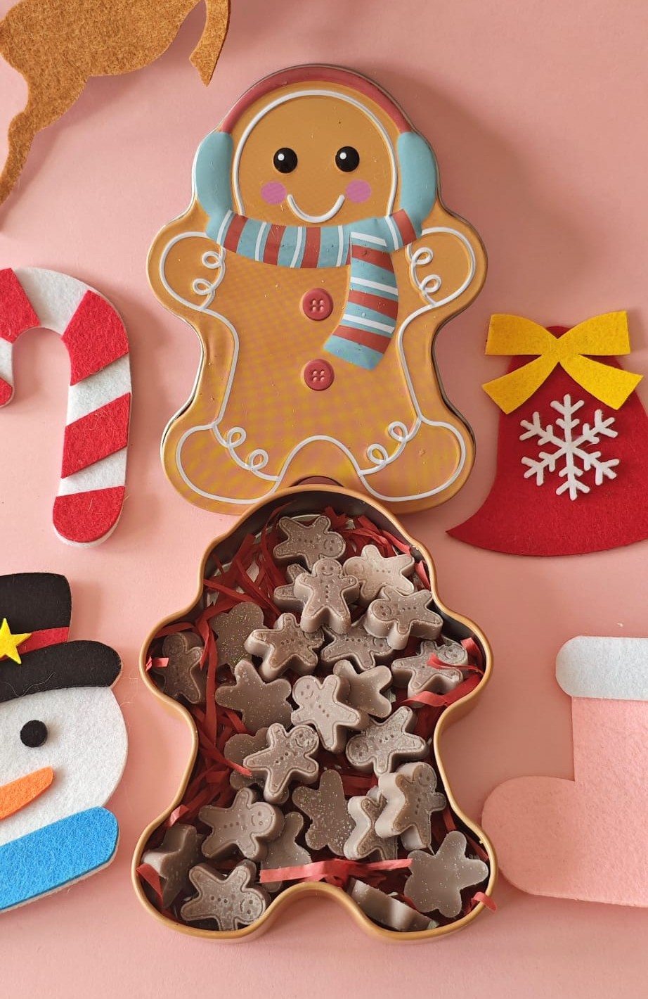 La caja metálica con forma de Muñeco de Jengibre es una explosión de Navidad en pequeño formato. Con aproximadamente 40 gramos de waxmelts con aroma a galleta de jengibre, es ideal para quienes disfrutan de los olores dulces, cálidos y especiados típicos de estas fechas.
