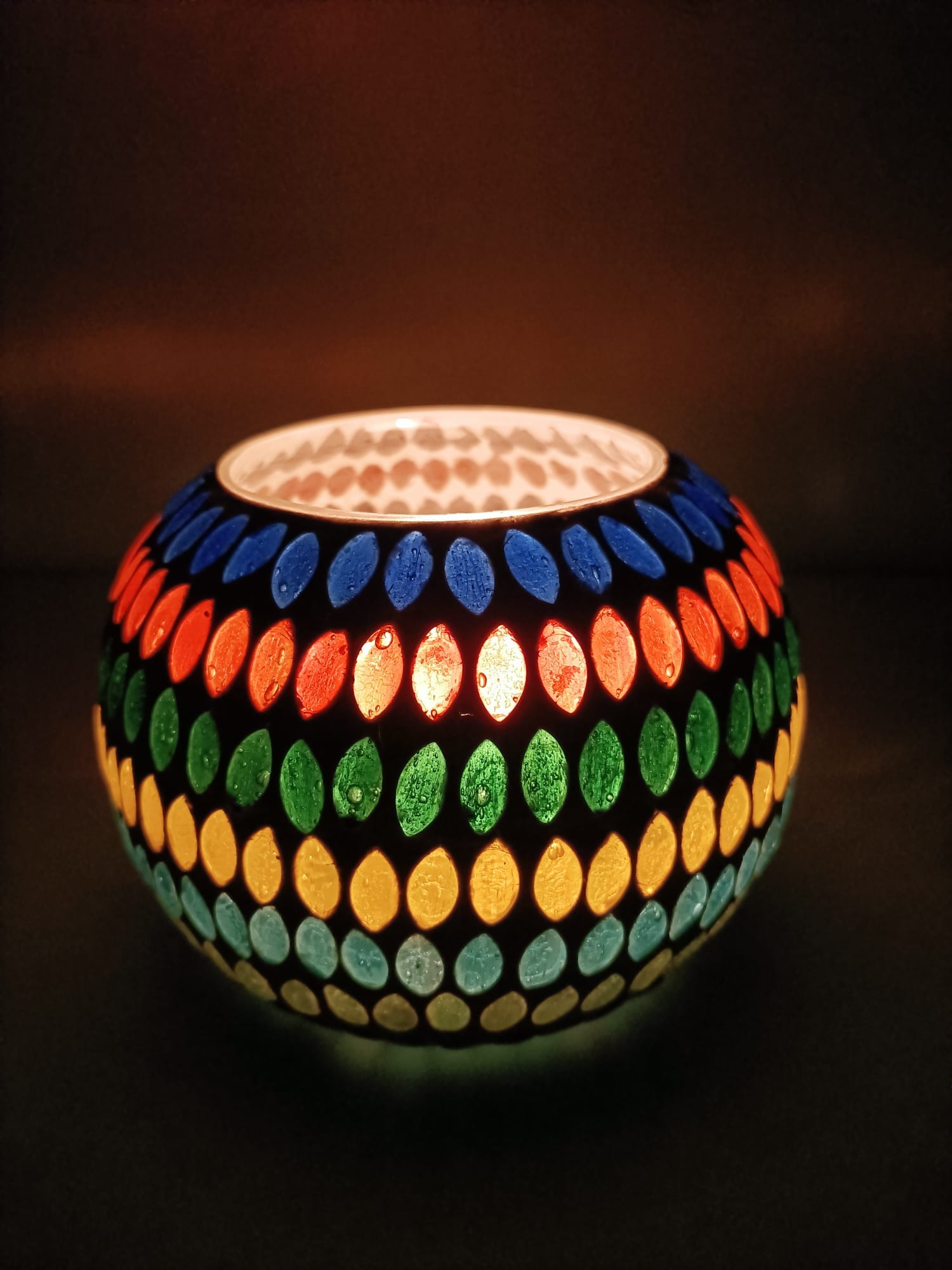 Ilumina tus espacios con el encanto artesanal de nuestro portavelas árabe de 9 cm de alto por 12 cm de ancho, decorado con un impresionante mosaico de gotas multicolores. Cada pieza refleja una luz cálida y envolvente que transforma cualquier rincón en un ambiente acogedor y lleno de magia.
