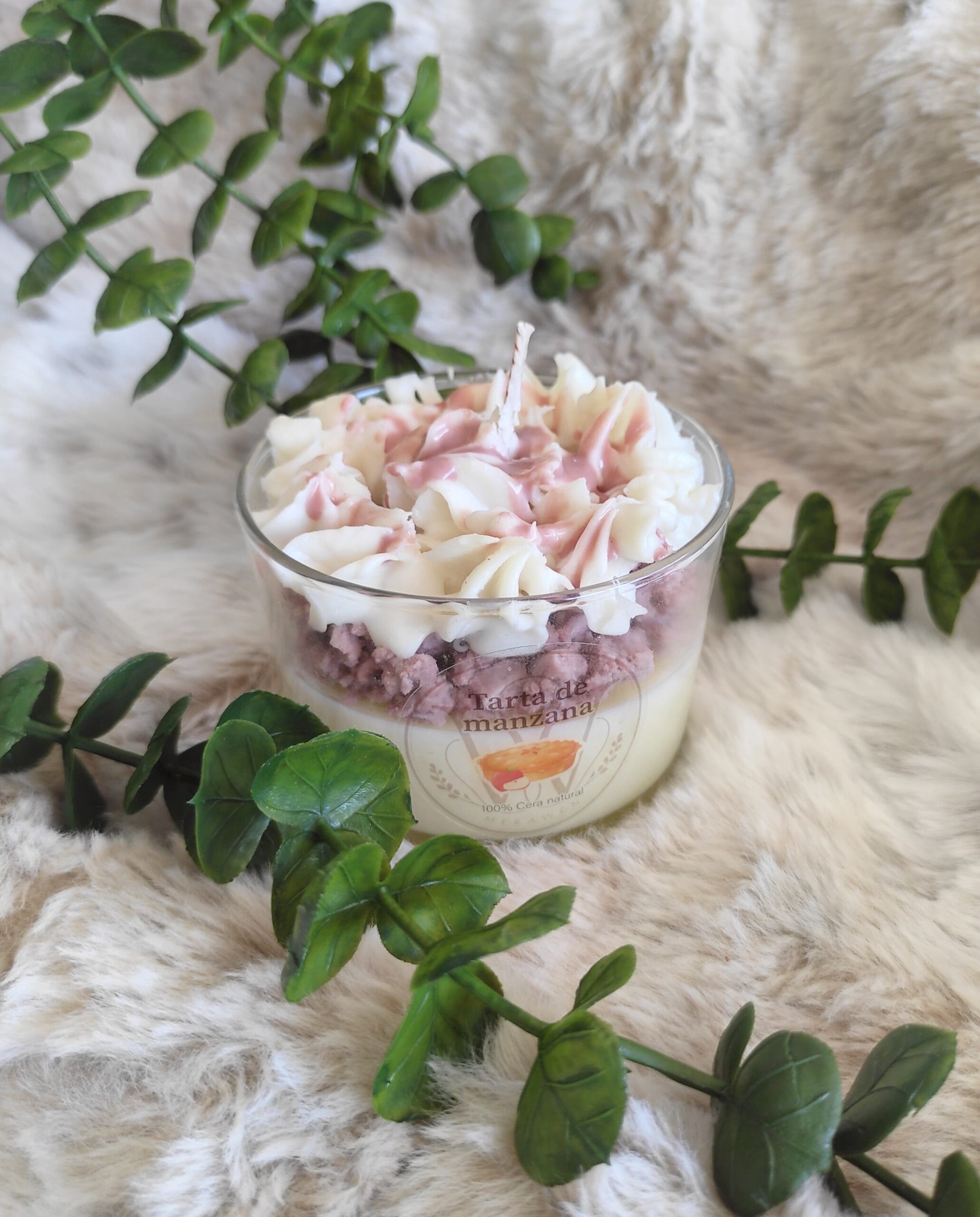 🍏 ¡Disfruta la calidez de nuestra vela de tarta de manzana con 150 gramos de cera de soja natural! 🍏